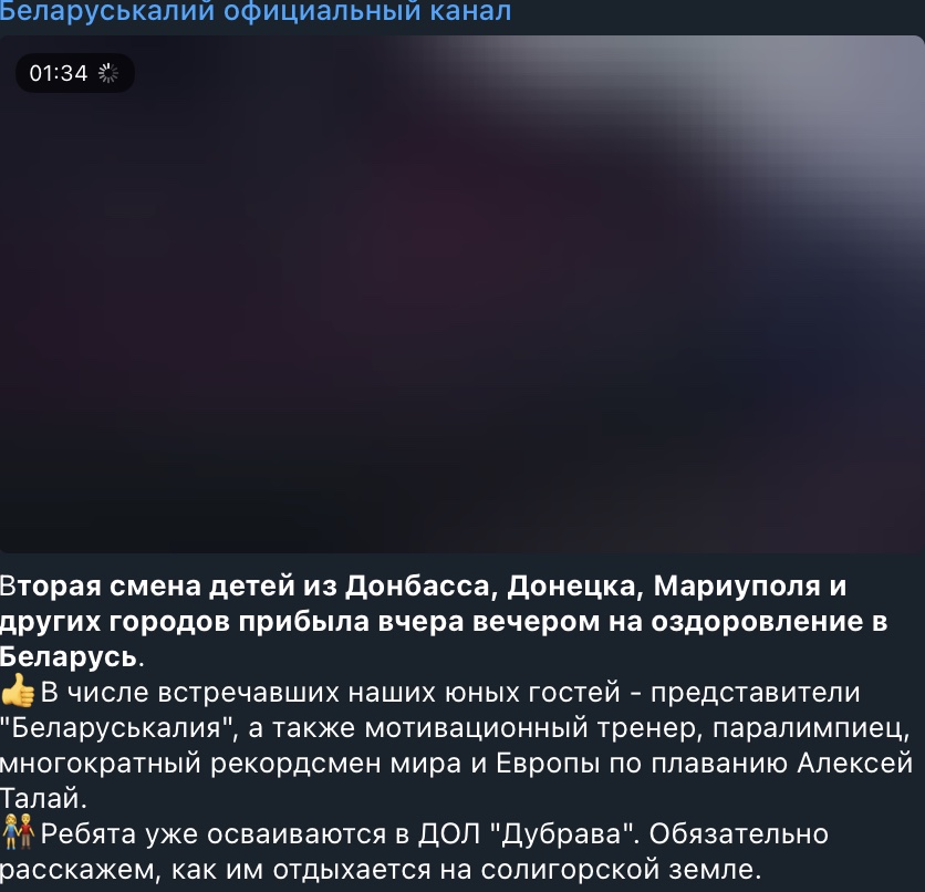 Однако, еще в июне 2022 года на телеканале «Беларусь 1» вышел сюжет о том, что более 400 детей с Донбасса уже прошли реабилитацию в беларуских санаториях. В сюжете упоминался детский лагерь «Зубренок» и санаторий в Червенском районе Минской области. Оздоровление проходило при поддержке все того же благотворительного фонда Алексея Талая.