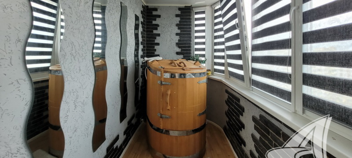 Самое интересное – это лоджия, на которой находится та самая мини-сауна. Речь о кедровой бочке. Напротив расположилось уютное кресло-гамак белого цвета. Дизайн самой лоджии выглядит, мягко говоря, аляповатым. Здесь как будто бы задумывали повторить стиль прихожей.