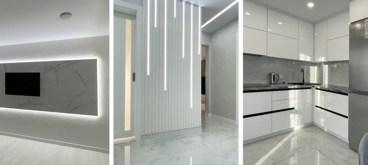 Интересные дизайнерские решения воплощены в квартире с помощью большого количества белого цвета, глянцевых поверхностей, ламинированных фасадов мебели и керамогранитной плитки, пишут в объявлении. Но, пожалуй, главное украшение квартиры — ее оригинальная подсветка. За счет разнопланового сценария освещения интерьер приобрел динамичный характер. Яркие световые линии и пятна акцентировали приоритетные зоны и декоративные элементы.