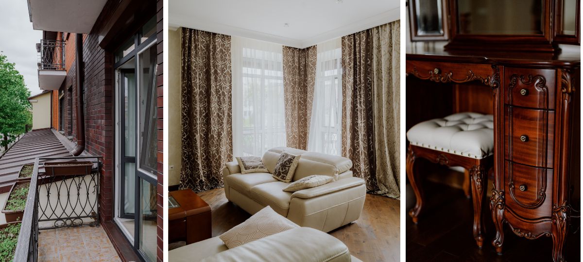 А вот в спальнях уже темная массивная и, судя по описанию, очень дорогая итальянская мебель из красного дерева. Подоконники выполнены из мрамора, а тканые светонепроницаемые шторы — из коллекции Pierre Cardin. Установлены кондиционеры.