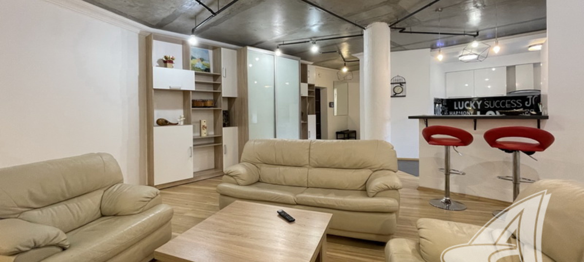 Ярким выражением стиля лофт в интерьере является креативное оформление многоуровневых потолков и всей системы освещения. С помощью симметричной расстановки мебельных групп обозначена граница между гостиной и кухней. Из нее есть выход на застекленную лоджию, где обустроена компактная лаунж-зона. К слову, мебель остается в квартире по договоренности.