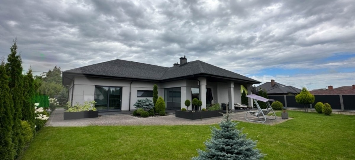 Стильный одноэтажный дом 2015 года постройки находится в микрорайоне Южный. В объявлении жилье называют еще бунгалом с отличной планировкой. Дом приятного голубиного цвета гармонично сочетается с зеленым газоном и ландшафтным дизайном.