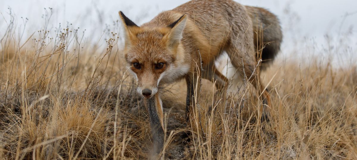 Лиса крадется в траве.