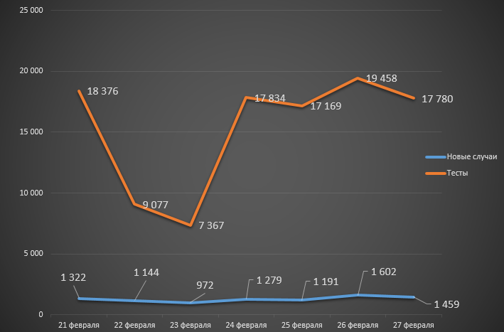 Наибольшее число зараженных было выявлено в пятницу – 1 602 случая. Наименьшее – во вторник (972). В среднем в течение всего месяца ежедневный прирост составил 1 641 случай, с 21 по 27 февраля – 1 281. Неделей ранее этот показатель равнялся 1 423 новым случаям заражения COVID-19.