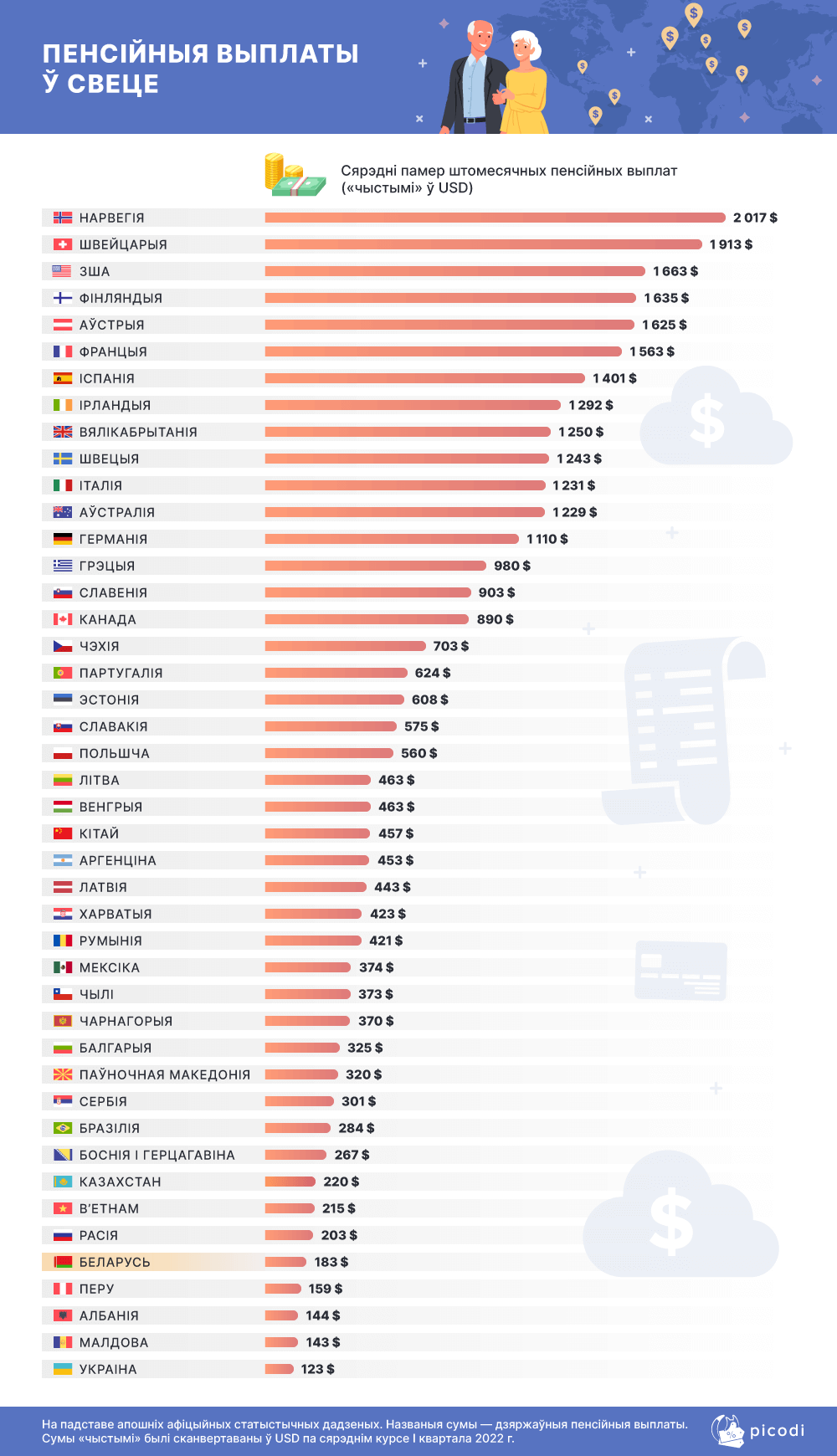 Среди 44 рассмотренных стран самую высокую пенсию получают жители Норвегии — 2 017 $ в месяц согласно последним официальным данным. Высокими пенсионными выплатами выделяются также Швейцария (1 913 $) и США (1 663 $).