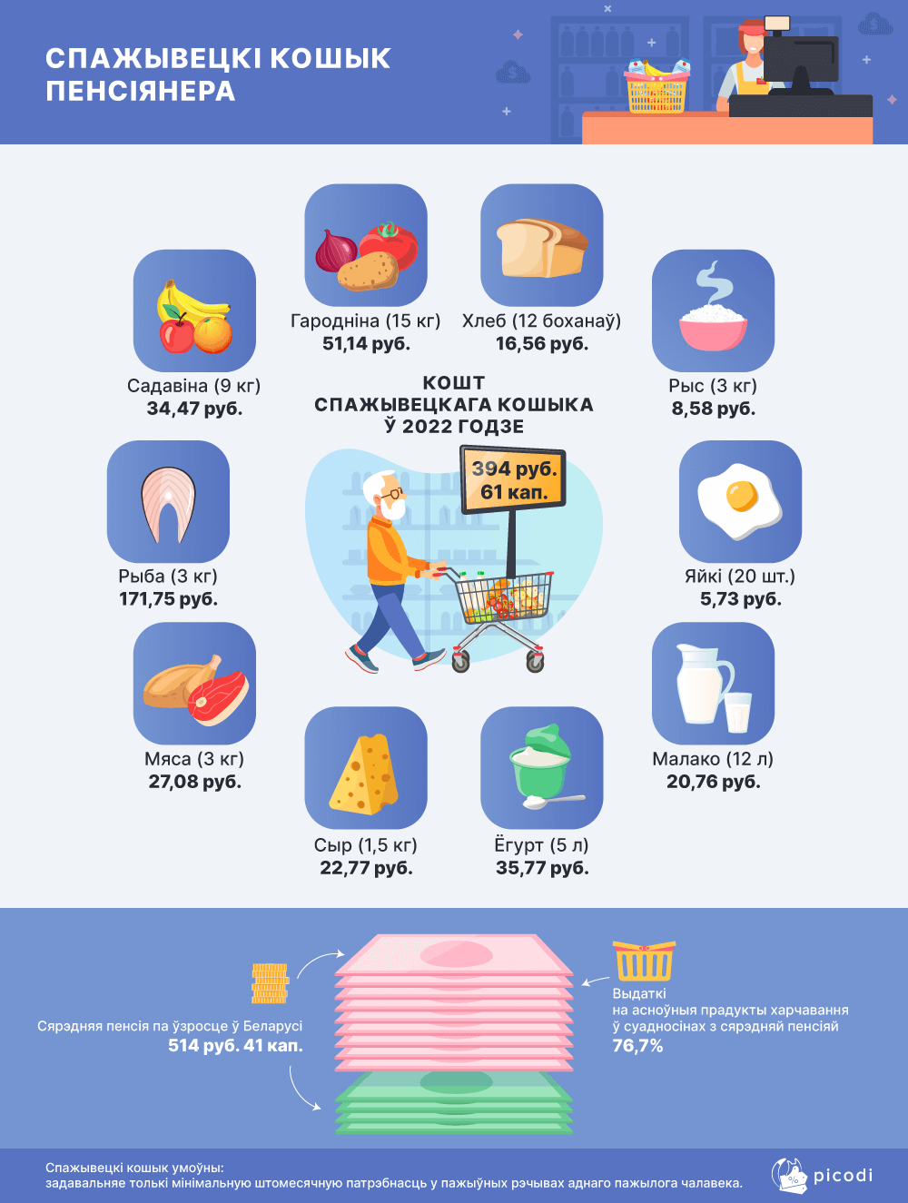 Стоимость основных продуктов питания в марте 2022 года составляет 394,61 руб. Таким образом минимальная продовольственная корзина равна 76,7% от средней беларуской пенсии по возрасту.