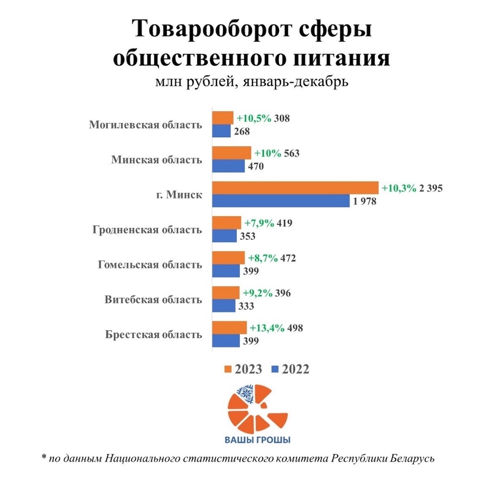 Существеннее всего расходы на общественное питание в минувшем году среди регионов выросли в Брестской области (+13,4%), а меньше всего в Гродненской (+7,9%). В столице рост расходов на общепит составил по итогам 2023 года 10,3%. При этом именно Минск формирует почти половину оборота услуг общественного питания.