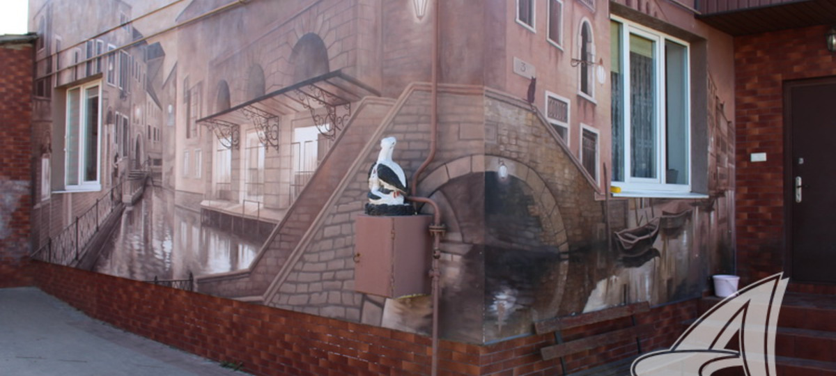 Двухэтажный дом с цоколем 2010 года постройки находится в северо-восточной части города, в микрорайоне Березовка. Роспись на фасаде здания – первое, что привлекает к себе внимание. Как сказано в объявлении, «профессионально выполненная художественная роспись стала неотъемлемой частью экстерьера, выделяя двухэтажный коттедж с цоколем из ряда идентичных жилых строений». И с этим не поспоришь.