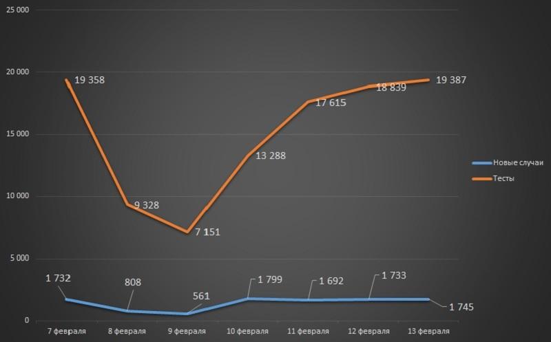 Продолжая следить за ковидными показателями в недельном цикле, можно сделать вывод, что заболеваемость, по официальной статистике, продолжает незначительно снижаться: если с 31 января по 6 февраля (напомним, мы выбрали диапазон с воскресенья по субботу) в стране было выявлено 10 389 инфицированных, то за период с 7 по 13 февраля – на 319 случаев меньше (10 070).