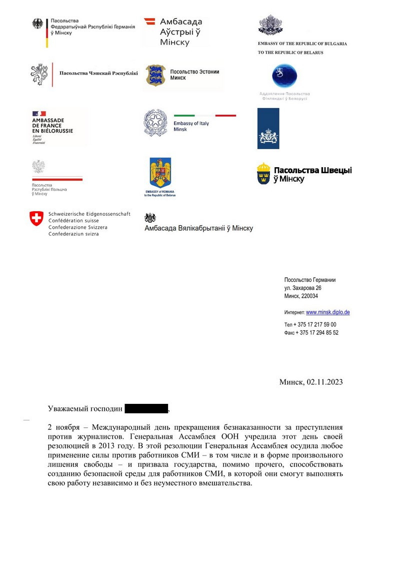 Европейские дипломаты написали письмо беларуским журналистам-политзаключенным по случаю Международного дня прекращения безнаказанности за преступления против журналистов. Он учрежден Генассамблеей ООН и отмечается 2 ноября.