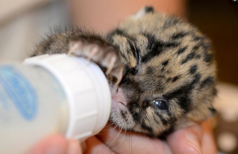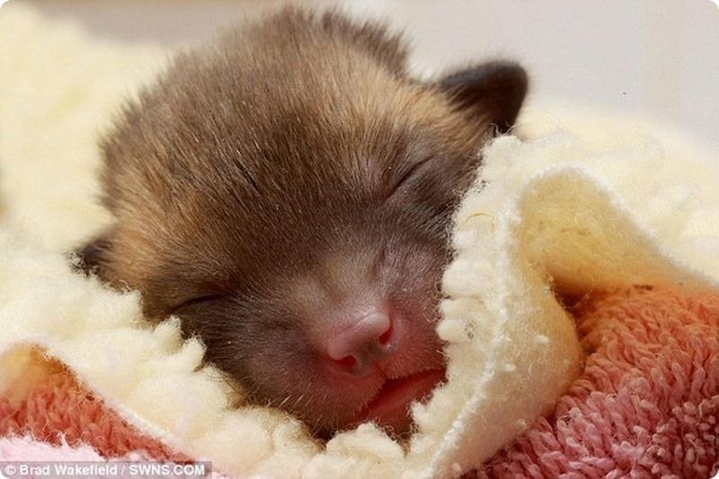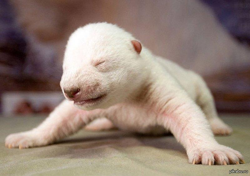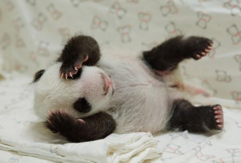 Новорожденная панда весит от 90 до 130 граммов, что составляет около 1/800 веса матери, но в отличие от других медведей покрыта тонким слоем меха.