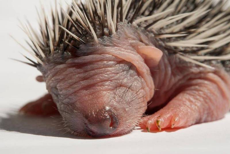 Ежата рождаются голыми, слепыми, с ярко-розовой кожей, масса их тела — всего 12 граммов. Через несколько часов после рождения у них появляются белые и темные мягкие иглы. Полностью тело ежат покрывается иголками к 15-му дню жизни.