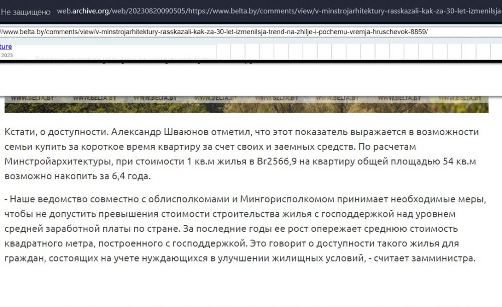 Позже этот фрагмент интервью был удален с сайта госагентства (в архиве все еще доступна сохраненная копия материала). В новой версии уже не указывается, сколько придется копить среднестатистическому беларусу на свою квартиру.