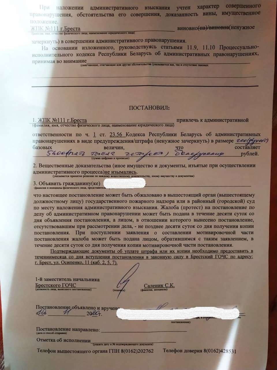 Согласно постановлению о наложении административного взыскания от 10 сентября (на следующий день после вывешивания флага – прим. ред.), в многоквартирном доме №80 нарушены требования законодательства о пожарной безопасности: лицо, ответственное за такую безопасность в ЖПК, не обучено в установленном порядке по программе пожарно-технического минимума, не разработана общеобъектовая инструкция о мерах пожарной безопасности работников кооператива и с ними не проводится инструктаж о мерах пожарной безопасности. Эти действия, по заключению инспектора пожарного надзора Антона Левлюха, подпадают под статью 23.56 «Нарушение законодательства о пожарной безопасности». Она влечет предупреждение или наложение штрафа в размере до 30 базовых величин, а на юридическое лицо – предупреждение или наложение штрафа в размере до 200 базовых величин.