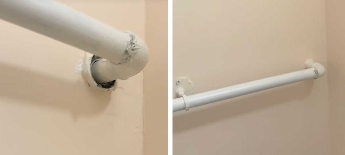 «Просто криво как-то, да? Что это вообще такое? Наш полотенчик, смотрите. Какой он… Какая красота. Вообще, мне вот эта картина нравится. Эта дырочка», — говорит она, показывая неровную установку и отверстия в стене.