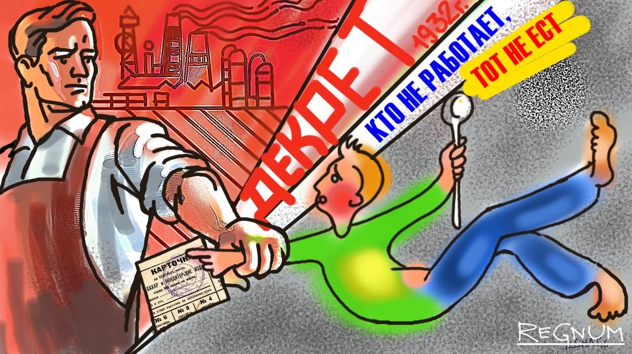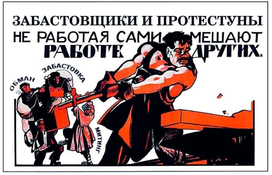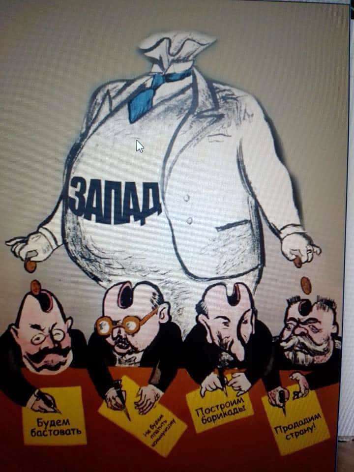 На одной из картинок, например, можно увидеть денежный мешок «Запад», который бросает монетки в головы-копилки тех, кто протестует, на еще одной – «забастовку», «обман» и «митинг», которые вырывают молот у мускулистого работяги и т. д.
